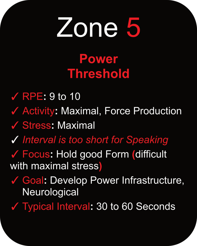 Similar to Zone 4, you will likely not use Zone 5 in racing, but the result of this training leads to improved Power Infrastructure which in turn leads to improved work in Zone 2 and Zone 3